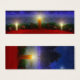 A 3D Christmas scene created in Vue, with candles set on red in front of pine garland accented with red and gold ornaments. In the snowy background are blue-green fir trees against a swirling fractal sky sprinkled with stars. A single sparkling star dominates the night sky.