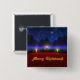 A 3D Christmas scene created in Vue, with candles set on red in front of pine garland accented with red and gold ornaments. In the snowy background are blue-green fir trees against a swirling fractal sky sprinkled with stars. A single sparkling star dominates the night sky. In front of the holiday decorations is a glowing gold Merry Christmas greeting.