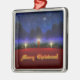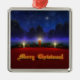 A 3D Christmas scene created in Vue, with candles set on red in front of pine garland accented with red and gold ornaments. In the snowy background are blue-green fir trees against a swirling fractal sky sprinkled with stars. A single sparkling star dominates the night sky. In front of the holiday decorations is a glowing gold Merry Christmas greeting.