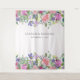 This stunning wedding photobooth backdrop features trendy watercolor flowers in shades of purple, pink, and magenta, with green leaves on a clean white background. There is a place to add your names or the event name, as well as the date.