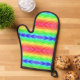 Brightly coloured oven mitt with a rainbow and diamond pattern on the front, black trim. Back is plain black with textured grip, loop for hanging.