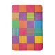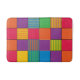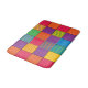 Bath mat with my design of boldly coloured squares and stripes in red, orange, yellow purple, green and turquoise.