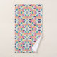 Brightly patterned towels and a washcloth with colorful floral and leaf designs in blue, pink, and orange tones, conveying a vibrant, cheerful atmosphere.
