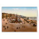 Notecard with a vintage photo lithograph of Brighton in East Sussex, England from 1895 pictures a row of colourful Victorian era townhouses, a clock tower, people, a bridge and a beach with golden sand. Digitally cleaned, enhanced and artistically rendered to resemble pen and ink with watercolors. Two sizes available; white envelope included.