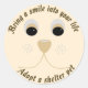 This button encourages adoption of shelter pets with a smiling face and the words "Bring a smile into your life. Adopt a shelter pet.