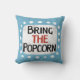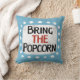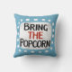 "Bring The Popcorn" is a cute text design in light blue with black and red text, along with a white accent shape and white textured whimsical dots surrounding it.