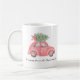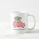 This basic holiday mug design features a red car with an evergreen tree. The text reads, "Bringing Home the Christmas Tree” and it can be customised .