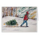 Watercolor painting of a boy bringing home the family's Christmas tree on his sled in the snow.