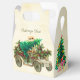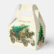 This Christmas Favour Box design features a vintage car on the front and back panels. The car is decorated with holly and berries. In the car there is a fresh Christmas tree with a SOLD tag. The background also as a vintage parchment look. On the two side panels the Christmas tree is decorated with berry garland, ornaments and a stare. On the from panel there's an area for custom text.