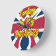The Union Jack pattern provides a strong and recognisable visual context, enhancing the celebratory nature of the piece.