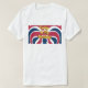 The primary colors are red, white, and blue, directly taken from the Union Jack, creating a vibrant and patriotic theme.