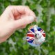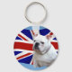 Shown is a photographic image of a white English bulldog in front of a British flag.