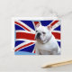 Shown is a photographic image of a white English bulldog in front of a British flag.