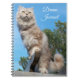 This notebook features a male purebred chocolate and silver tabby British Longhair cat looking off to the distance while standing on a wooden arbor. The customisable wording says, "Dream Journal" on it but you can change it to say whatever you want.