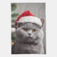 Cute blue/grey British shorthair cat wearing a Santa hat.