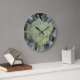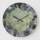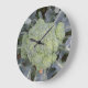 This awesome clock features a detailed photograph of a head of broccoli growing in a garden. The tightly bunched green florets are surrounded by the large outer leaves of the vegetable.