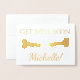 This get-well-soon gold foil greeting card features the message "Get Well Soon" on the front, along with a customisable name and a representation of a fractured bone. The inside features a personalised message, as well.