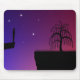 A drawing of a man standing silhouetted on a broken bridge, looking across the gulf where a lone willow tree stands. In the sky behind him are the moon and stars in a dark blue sky, fading to red on the far side for the beginning of the sunrise. An illustration of the emotions of hope, despair, and loneliness as he reaches the end of the road and finds the way impassable.