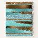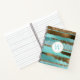 Glitzy monogrammed wire notebook, with graphics of a aqua and bronze foil and glitter looking striped pattern. A thin gold edged white circle text area, on the front of the notebook, has a aqua single letter monogram ready to personalise.