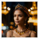 A cinematic portrait of a striking woman illuminated by warm bronze-toned split lighting. She wears a luxurious bronze jewelry set adorned with citrine, amber, and yellow topaz, including a sculptural tiara, bold chandelier earrings, and a layered collar necklace. Her dark auburn gown complements the golden city night bokeh in the softly blurred background, creating a glamorous and opulent atmosphere.