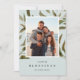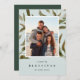 Elegant botanical holiday photo card sets your favorite family photo on a background of green and brown handpainted leaves, on a pale sage green background. Personalize with your names or family name beneath a Christmas greeting ("counting blessings") in elegant, classic lettering. Add three additional photos to the reverse side on a contrasting hunter green background, along with the year.