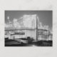 This is a black and white photograph of the Brooklyn Bridge at night.