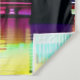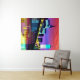 Tapestry in a digital painting of the New York City skyline, featuring the Brooklyn Bridge at nightfall, in vivid shades of blue and deep fuchsia pink