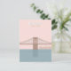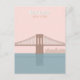 Minimalist graphic illustration of the Brooklyn Bridge with a light pink sky and calm blue water. New York skyline silhouette in the background.