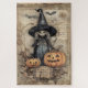 An enchantress stands poised in twilight—draped in a flowing cloak, wand in hand—flanked by glowing jack-o'-lanterns etched with mischievous smiles. Behind her, a backdrop of vintage parchment unfurls with eerie ink illustrations of bats and webs, giving the scene a timeless, spellbound quality. Autumn leaves tumble gently through the composition, casting a golden warmth over the haunted hush. This piece captures the quiet power of Halloween magic with rustic elegance and whimsical flair.