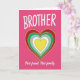 This card has a hot pink background that feels bright and affectionate right away. Near the top, the word “BROTHER” appears in rounded white letters with a slight shadow that makes it stand out. In the center, there’s a large layered heart made of rings of deep red, forest green, sky blue, white, and a sunny yellow middle. A thin gold outline traces each layer, giving the heart a special, gift-like touch. Near the bottom, the message “Part friend. Part family.” is written in a flowing cursive style in white, placed neatly under the heart. The simple layout makes it easy to focus on love and appreciation for a brother who’s also a close friend 🥰. It’s a meaningful way to say you care without needing a lot of extra words ❤️. Ending it with this card is a friendly way to share Valentine’s Day sentiments.