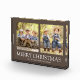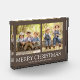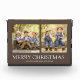 Acrylic photo block with 2 of your favourite photos on a customisable brown background. Text says, "Merry Christmas." but make it say anything you want. Personalised with names or your own additional text.