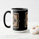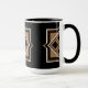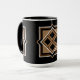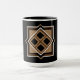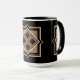 A coffee mug with a contemporary geometric design. Overlayed on a black background, the design features black and brown squares and diamonds. The background can be customised by changing the colour. The rim and handle of the mug come in five colours; shown here in black.