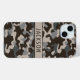 Customize this brown and gray camouflage iPhone 15 plus case with your name in a trendy modern CAP font in brown on taupe. It's masculine and perfect for your favorite military, hunting, country or outdoorsman!