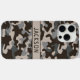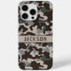 Customize this brown and gray camouflage iPhone 15 pro case with your name in a trendy modern CAP font in brown on taupe. It's masculine and perfect for your favorite military, hunting, country or outdoorsman!