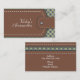Brown and green leather look and pattern accessories business card template featuring two brown bands with seams and a button in leather style-not real leather just a PRINTED image and geometric pattern in grey and light green.