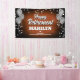 Fun banner sign for indoors or out, featuring festive silver metallic balloons on both sides of the design with sparkly, silver metallic confetti on a rich textured chocolate brown background for your personalised retirement party banner.