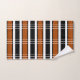 This towel set has a geometric design of a plaid with brown and white lines on a black background.