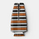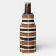 This bottle cooler has a geometric design of a plaid with brown and white lines on a black background.