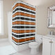 This shower curtain has a geometric design of a plaid with brown and white lines on a black background.