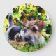 A black brown and white Terrier Puppy on the ground behind a log. With one paw up on the log and the green tree vines falling behind him. On this oil painting on this wall clock