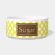 Cute and chic white polka dots pattern on a yellow background colour. There is also a customisable text area for your pet's name on a brown background.
