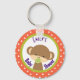 Baby shower keychain. Designed with a cute baby monkey holding a pacifier in his mouth inside a circle with an olive green border. The background is an orange and white polka dot pattern.