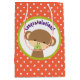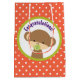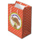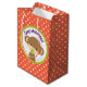 A gift bagwhich says congratulations! With a cute baby monkey with a pacifier in his mouth Inside an olive green circle. The background is an orange and white polka dot pattern.