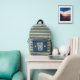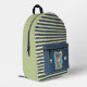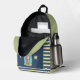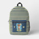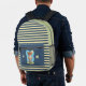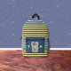 Cute backpack for kids featuring an funny brown bear eating an enormous ice cream cone . It has 3 main colours (blue , green and yellow) including a striped pattern on the front . Personalise with the initials of the child .