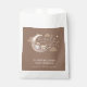 Cute sleepy cub bear sleep on the moon theme, design with beige, brown cream, tan colour scheme. baby shower featuring watercolor illustration of a cub with boho moon, cloud, star. The text says "we can bearly wait!" This favour bag is great for a gender neutral shower in the winter, spring, fall and summer.