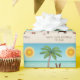 Destei's original cartoon illustration of a cute chocolate brown and white coat colour Boston Terrier breed dog standing in a tropical summer beach scene. On the beige colour sand there is a palm tree, a pink seashell together with a starfish and a red crab. The water is turquoise blue with some waves and the sun is shining above the horizon. There is also a personalizable text area.