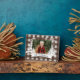 Rustic farm fresh Christmas trees family photo keepsake plaque. The plaque can be customised with the family name, the year, and the photo. brown chequerboard plaid background with rustic pine trees and snowflakes. The family name is displayed in a white banner. Artwork by Moodthology Papery.