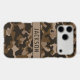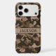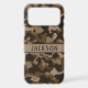 Customize this multi-hued brown camouflage iPhone 17 pro max case with your name in a trendy modern CAP font in dark brown on light brown. It's masculine and perfect for your favorite military, hunting, country or outdoorsman!