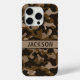Customize this multi-hued brown camouflage iPhone 15 pro case with your name in a trendy modern CAP font in dark brown on light brown. It's masculine and perfect for your favorite military, hunting, country or outdoorsman!