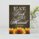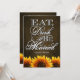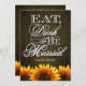 Eat Drink & Be Married Brown Chalkboard Sunflower Wedding Invitations---match the RSVP cards and more found below on this page. Compliment your sunflower wedding theme with these invitations that feature a brown chalkboard texture as a background with Eat, Drink & Be Married in elegant script with vibrant sunflowers at the bottom of the front and back of each invitation.